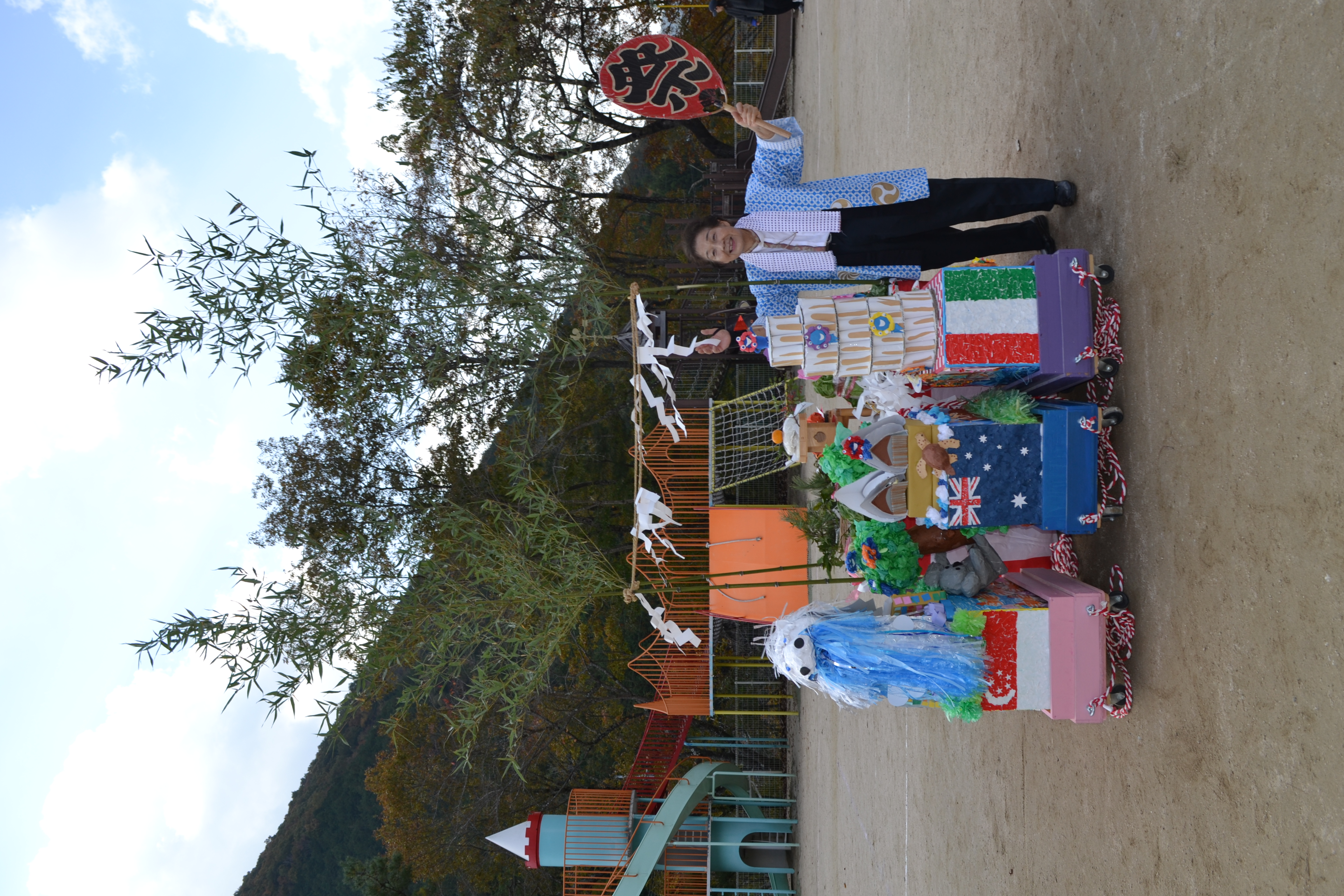 縦割りのクラス編成で作ったお神輿で練り歩き!!テーマは、「世界の国の名所・名産品」です。年長組が神輿を引いて練り歩き、2歳児・年少・年中組は、それぞれ神輿の前後をかため、しっかり応援しました。「わっしょい!!」「わっしょい!!」と元気な声が空に響き渡り、おうちの方と一体となった掛け声は、子どもたちの心に残ったことと思います。輪踊りでは、身体を元気いっぱい動かして表現していた子どもたちです。
