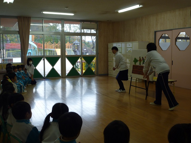 先生からの大型紙芝居のお話は、「あかずきん」です。おおかみに食べられてしまう「おばあさん」と「あかずきんちゃん」の仕掛けが楽しかったです。