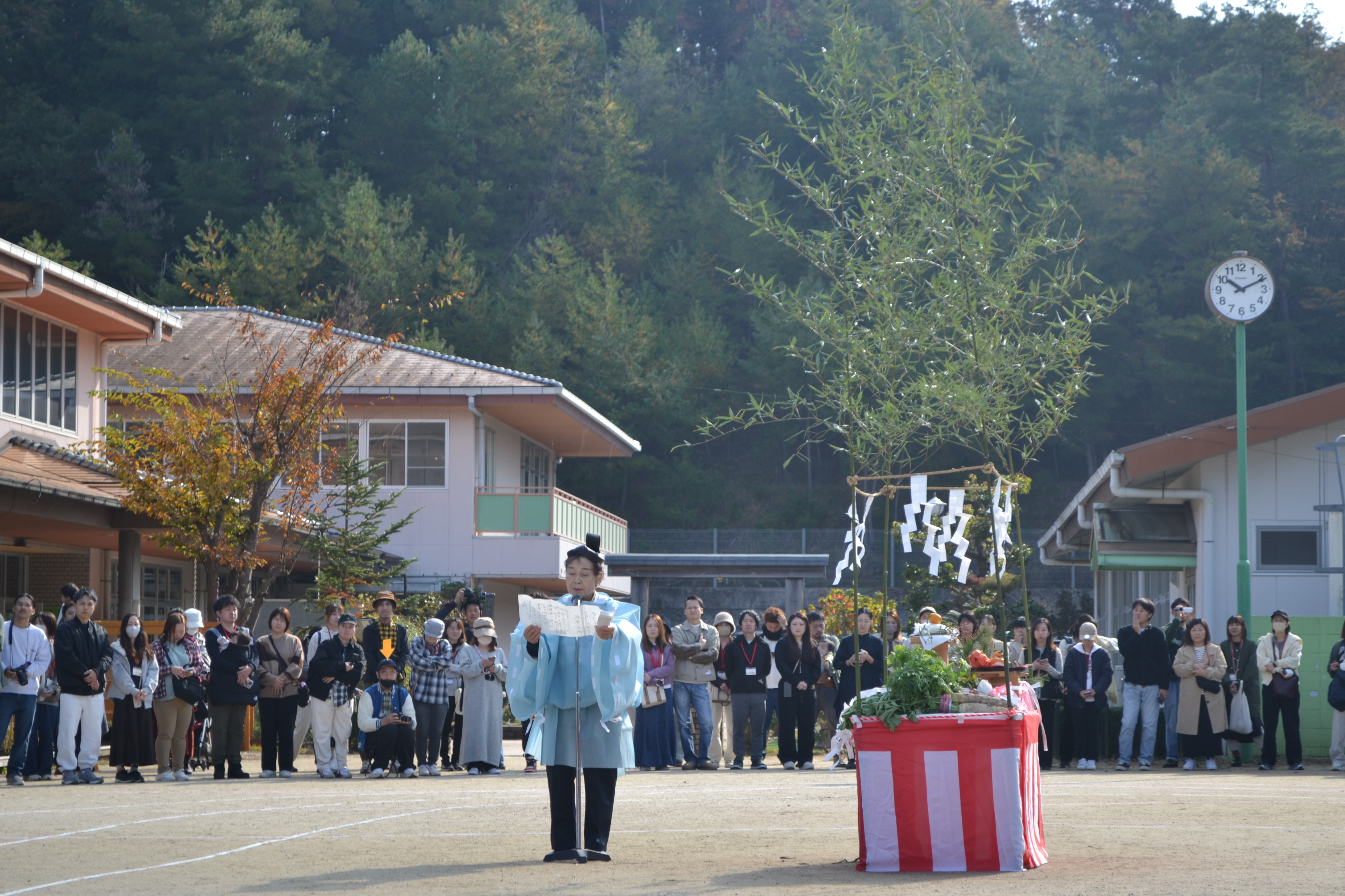幼稚園に神様がやってきて祝詞をあげ、<実りの秋、日ごろの収穫への感謝とこれからもみんなが健康に気を付けながら元気に過ごせますように>と、天に祈りました。