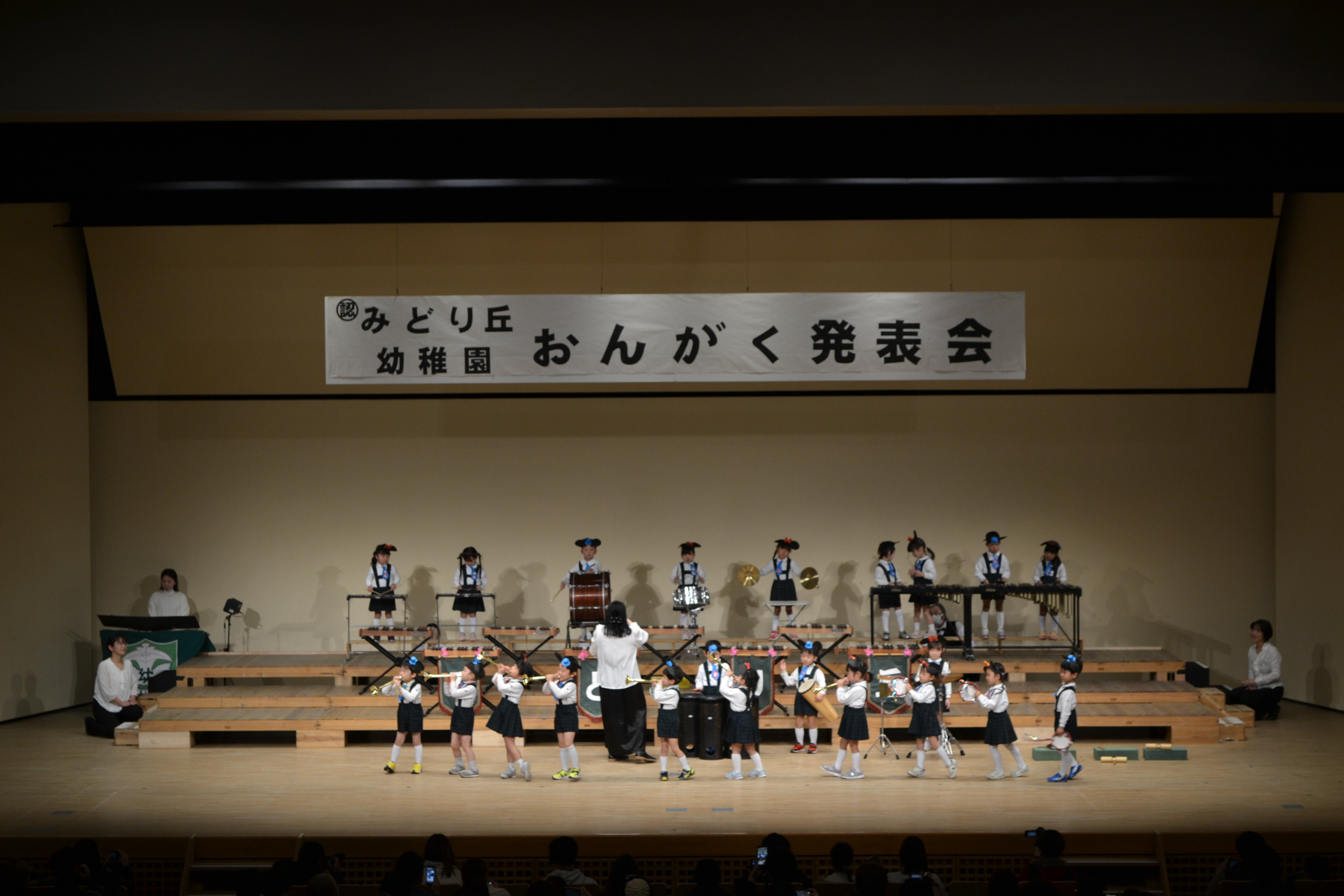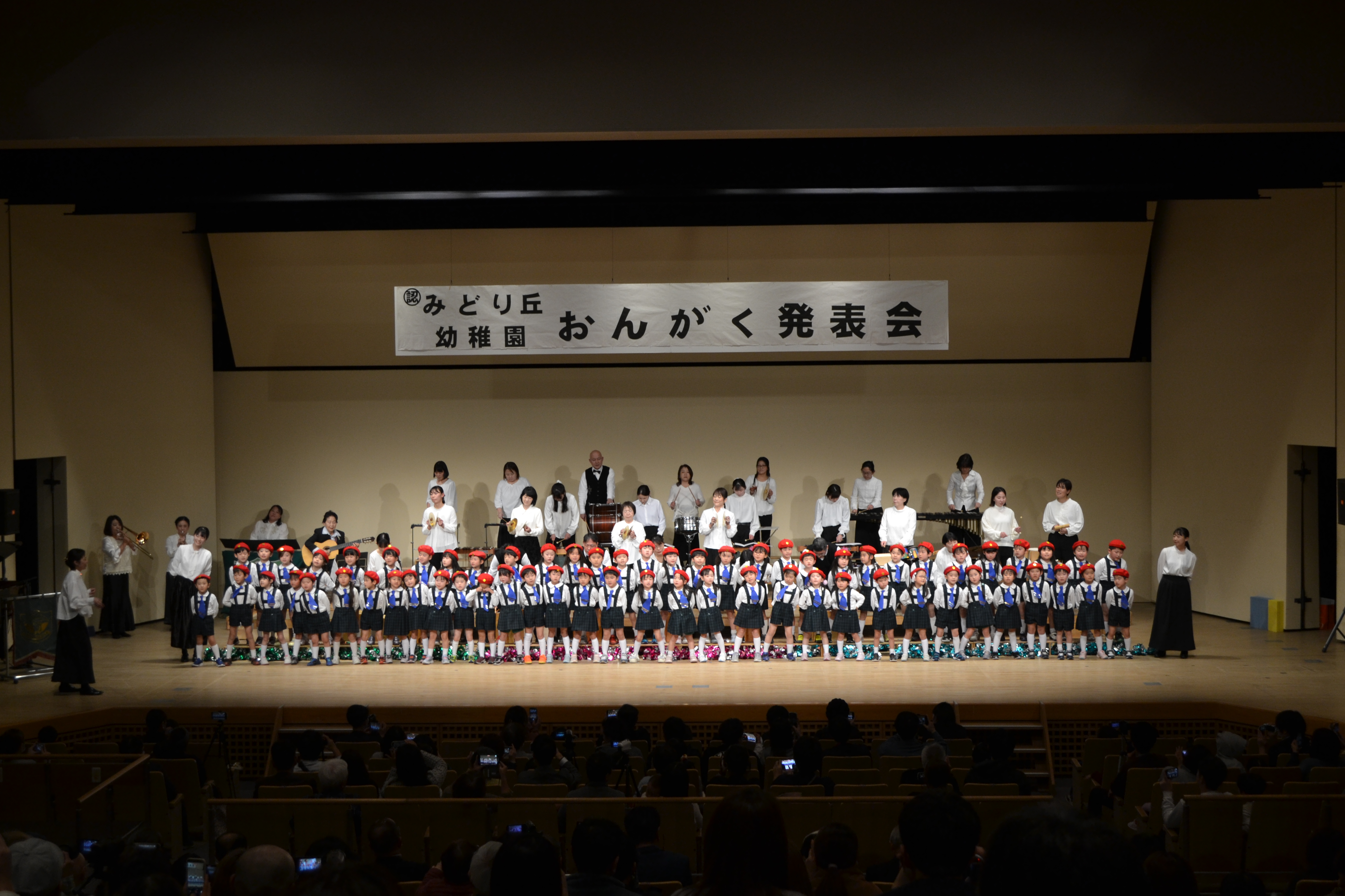 年長児は♪休符(静寂)を知る子どもたち。イメージを豊かにこころを一つに♪今までの遊びの経験の中で、友達と共に沢山の楽器を演奏したり、歌を歌ってきました。音楽会での選曲も、それぞれが部分部分を演奏できるように工夫しアレンジされており、年長児らしく立派に表現できました。