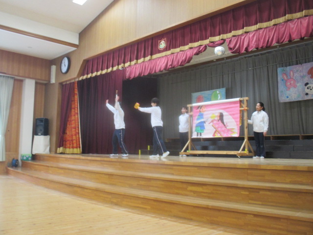 先生からの大型紙芝居のお話は、「一寸法師」です。一寸法師が打ち出の小槌で大きくなっていくところが子ども達も楽しかたです。