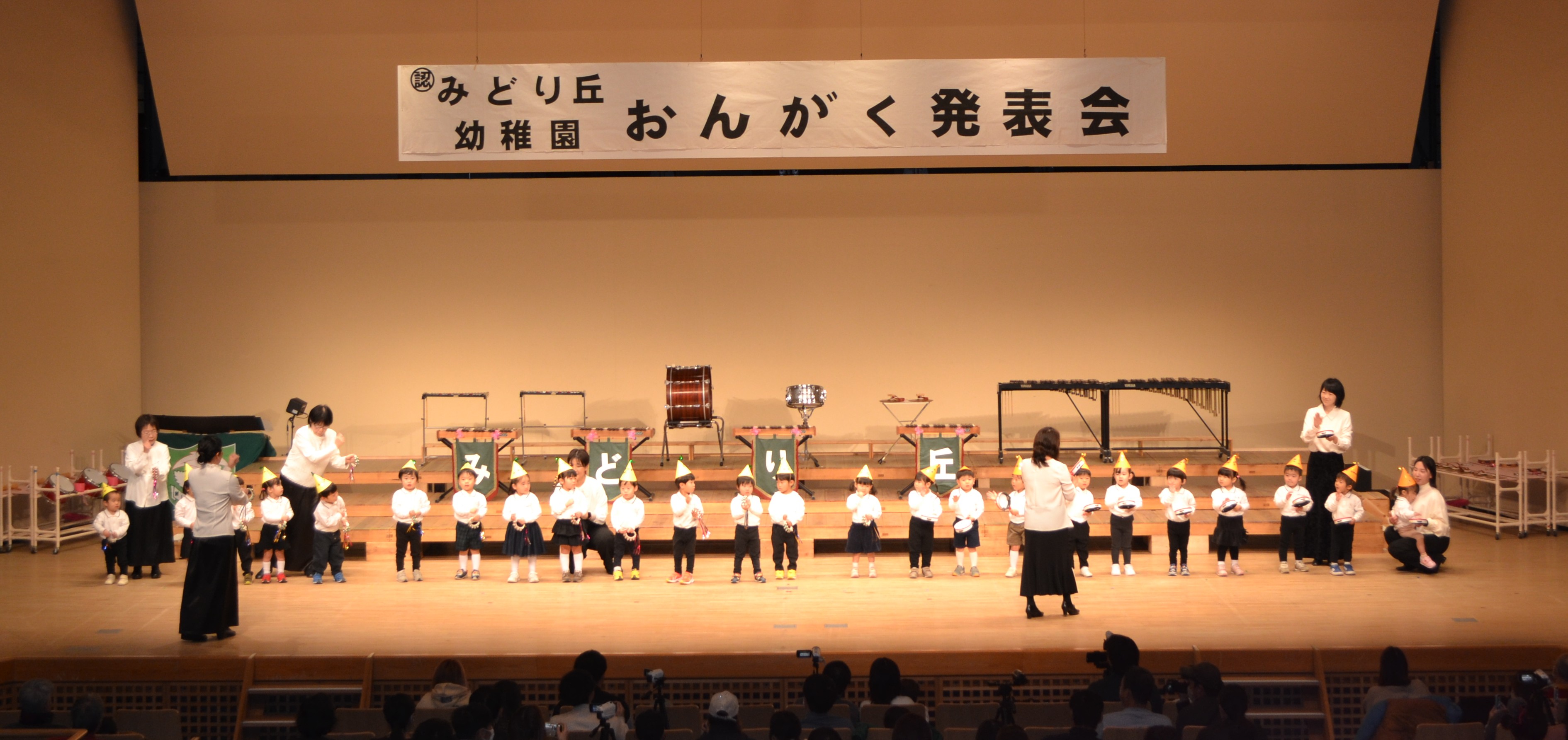 年中組は、♪吸収力を高めた子どもたち。リズムやメロディーを奏で合奏に♪基本的なリズムを変化させ、旋律楽器も加わることで分担奏から合奏へと進化し、歌と合奏、みんなで表現する楽しさを味わいました。