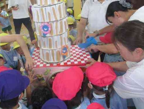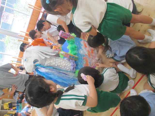 世界に視野を広げ、年長児が国の名物や特産品等を調べ、どんなものを作るか相談をして、年中さんや年少さん・2歳児のお部屋にお話しをしにいく姿が見られました。クラスで作った作品をお神輿に合同で製作していきます。さて、どこの国のお神輿かな~?各お神輿には「ミャクミャク」も乗っていましたよ。完成をお楽しみに。