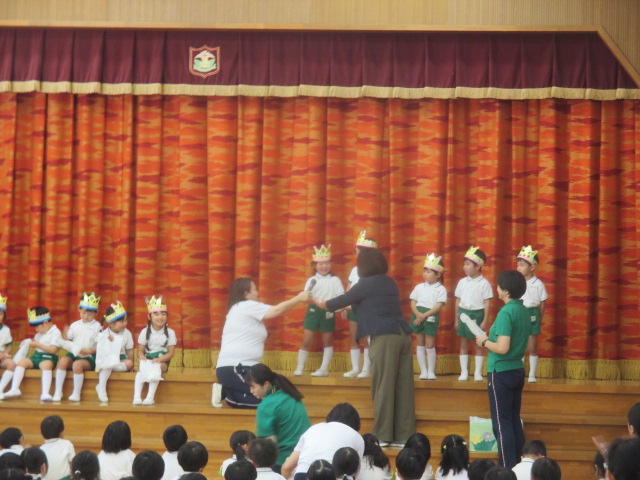 年少~年長組の【9月 お誕生日会】、秋の風が吹き始めました。入場では、自分の名前やプレゼントをいただいて「ありがとう」としっかりと言えるようになりました。