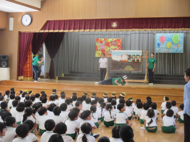 先生からの大型紙芝居のお話は、「うさぎとかめ」。
