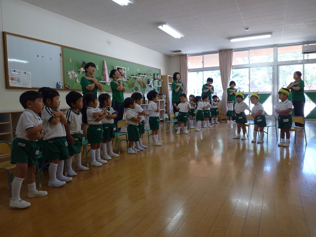 歌のプレゼントは年少「とんぼのめがね」年中「しょじょじのたぬきばやし」年長「みかんの花」です。
