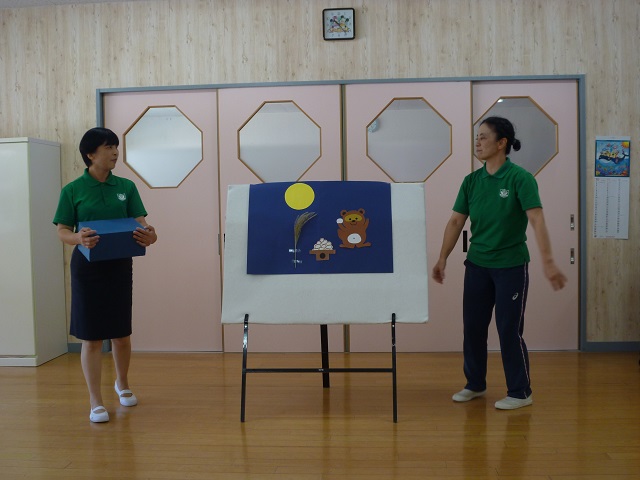箱の中からは月見団子(dumpling)・たぬき(raccoon)・すすき(pampas grass)・満月(full moon)が出てきて、十五夜のお話を聞きました。