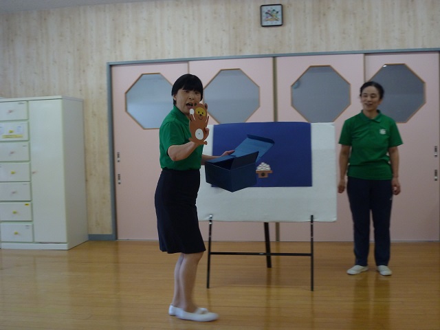 先生からの大型紙芝居のお話は、「3匹のこぶた」。ミュージカル風の劇に子ども達も一緒に「フー!!!」とおおかみ役になって楽しみました。