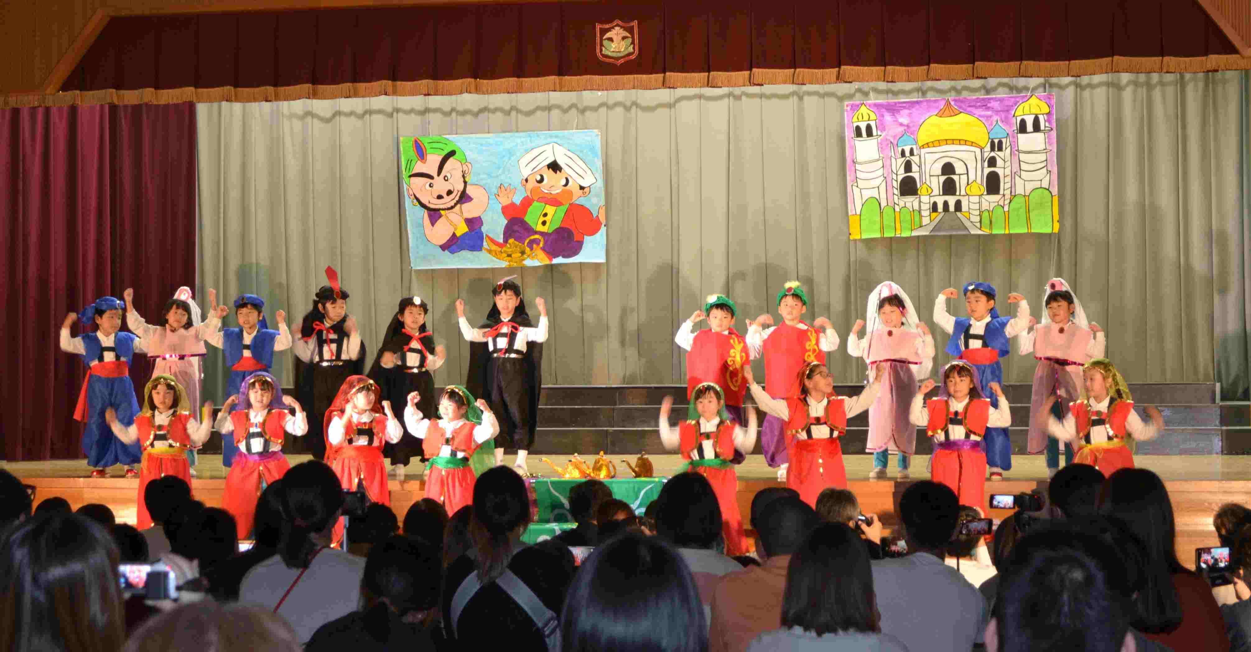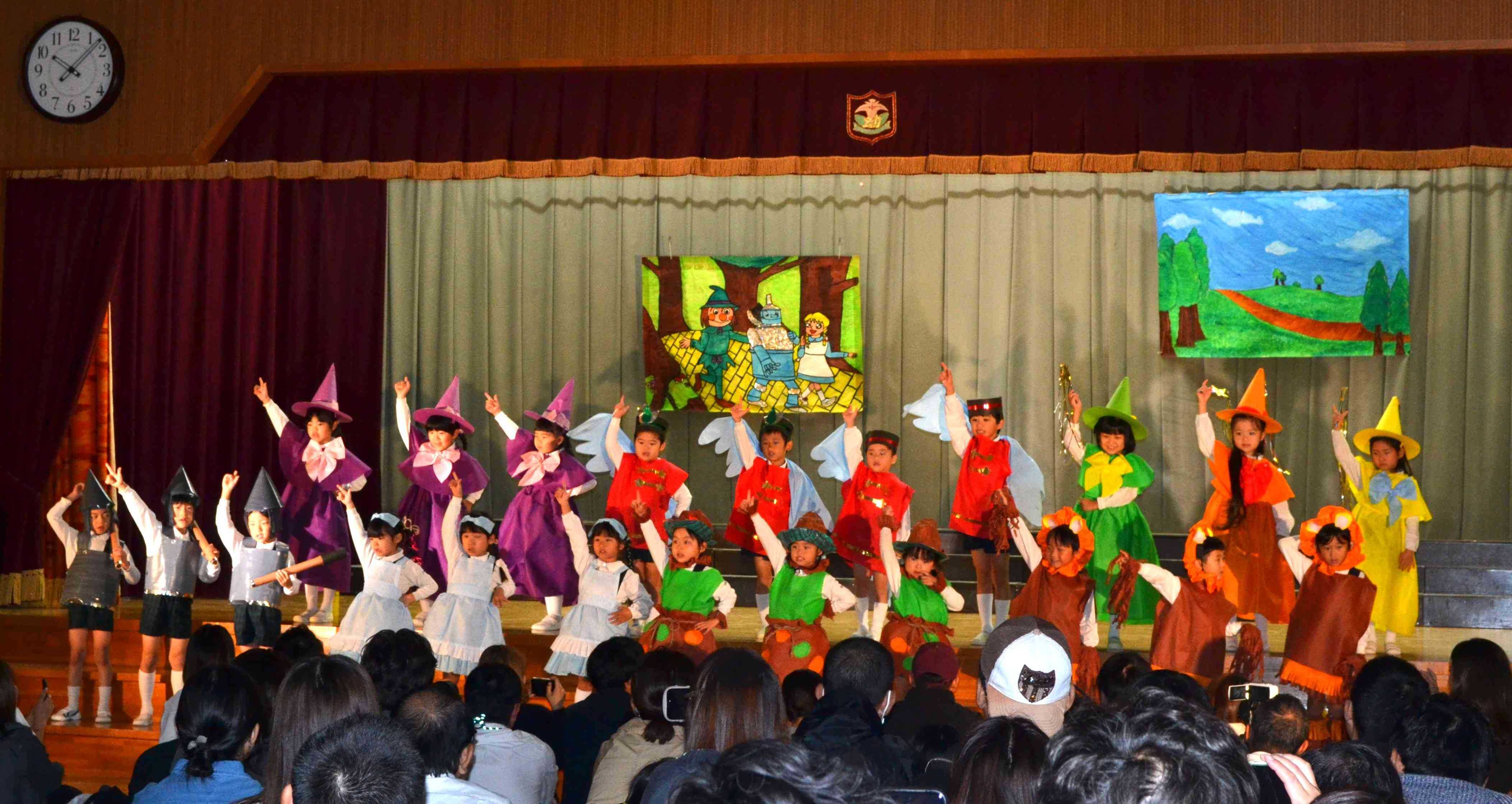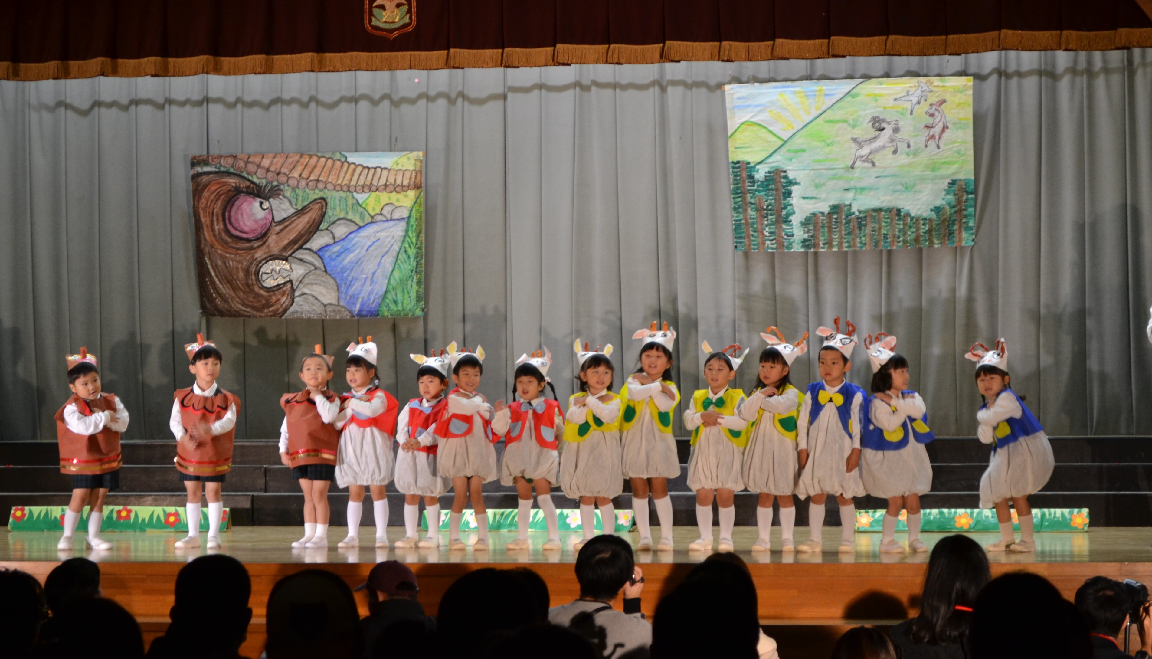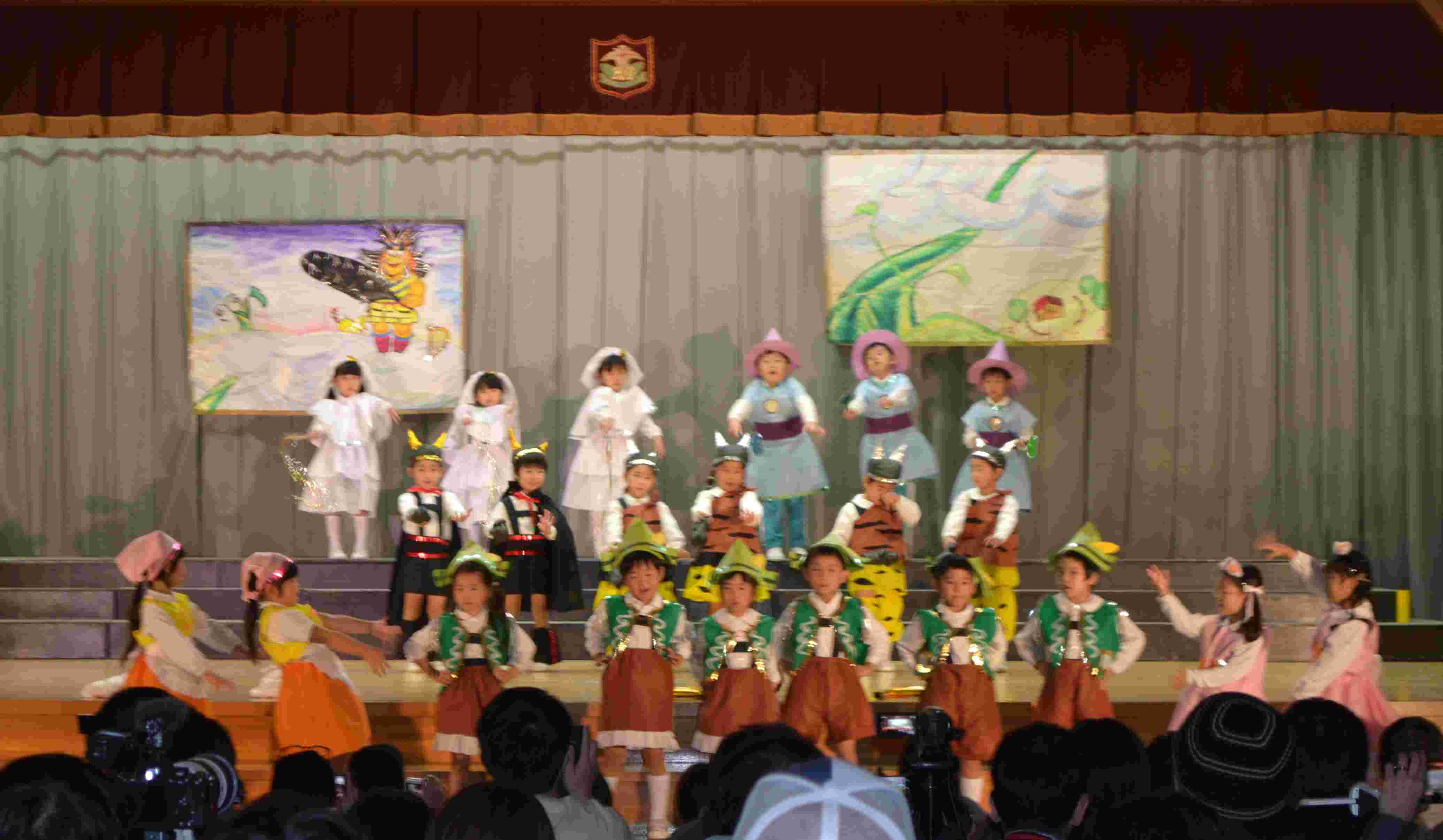 子どもたちは、自分を表現することが大好き!社会生活の第一歩である幼稚園生活の中で“喜怒哀楽”、感情豊かに自分の気持ちや思いを表現しています。2歳児は、初めての舞台!一生懸命舞台に立つことができました。年少組は、保育者と一緒にピアノに合わせて、歌とセリフで物語を作っていく中で、自分たちで歌う、セリフを言って役になりきって物語を進めていく楽しみを感じました。