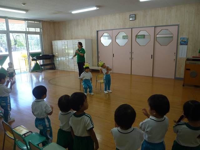 2歳児の10月生まれの誕生会をしました。誕生日のお友だちは3人。お家の人に見守られながら誕生会に参加することができました。