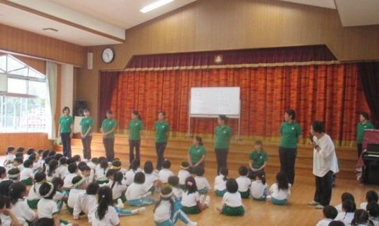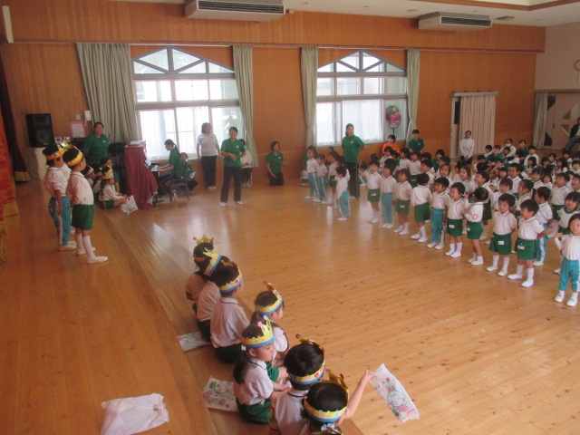 歌のプレゼントは年少「どんぐりころころ」年中「森のくまさん」年長「うたえバンバン」をプレゼント。どの学年も元気にプレゼントができました。