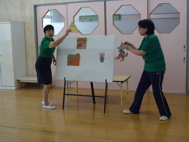 先生からのお話のプレゼントは『三匹のこぶた』のパネルシアター。small、middle、bigのthree pigが、藁のお家(straw house)木のお家(wooden house)レンガのお家(brick house)のお家を建てました。そこへやってきた狼が藁と木のお家を吹き飛ばします。吹き飛ばすことは英語で「huff and puff」。狼と一緒にみんなで「huff and puff」と大きな声で参加する姿が見られました。狼が逃げていき、三匹のこぶたがレンガのお家で仲良く暮らすことできてよかったですね。