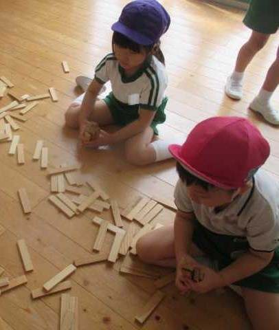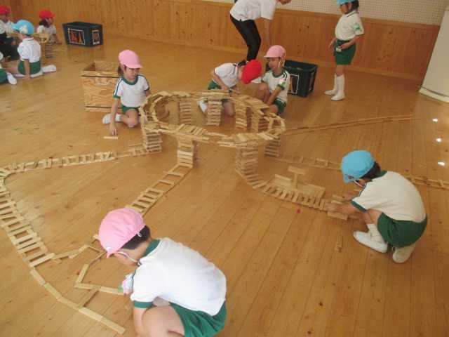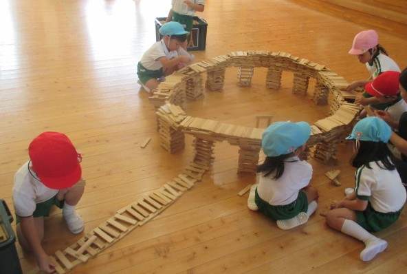 カプラのインストラクターの先生と「カプラであそぼう」がありました。今月は「橋をつくろう!」です。異年齢の8人~10人のグループで年長児~年少児が一緒に、個々に土台を作っていきながら、年長児が「高さは同じになるように…」丁寧に教えてくれていました。一緒に大きな橋ができていく様子に期待と喜びを感じ、想像と創造、豊かに表現していますた。