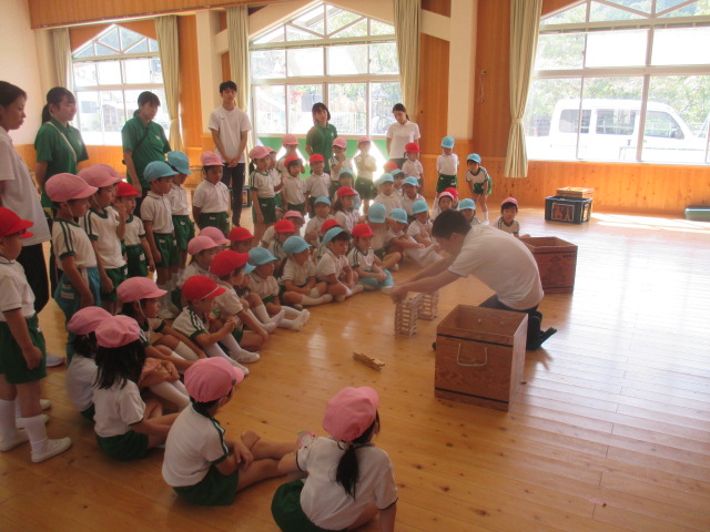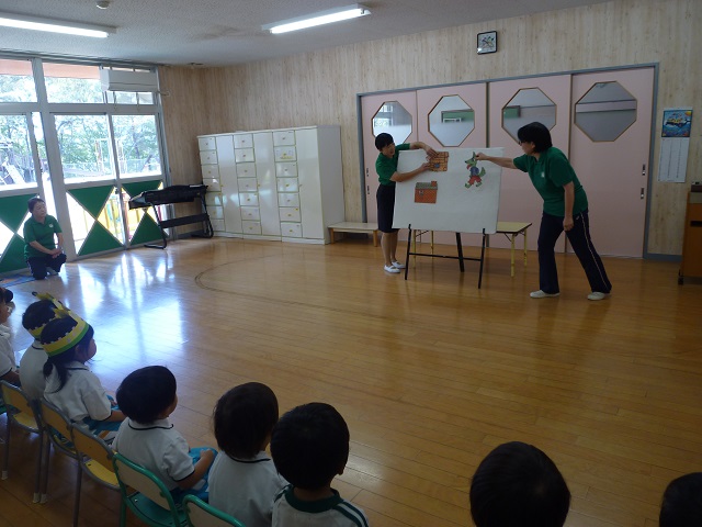 先生からの大型紙芝居のお話は、「おむすびころりん」です。おむすびがコロコロコロコロ転がって…おじいさんも転がって…楽しかったですね。