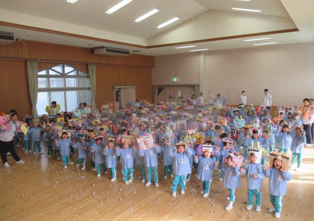 豆まきの日…。「おにって来るのかな…??」自分たちで作ったお面をかぶって、新聞紙の豆を持って遊戯室に集まりました。