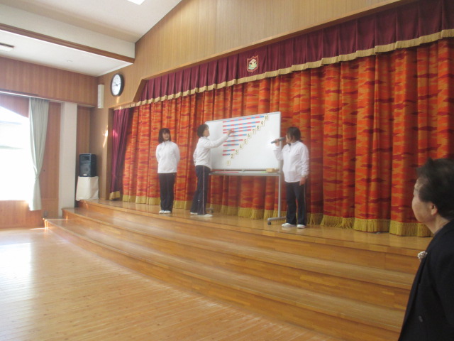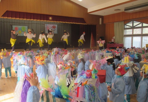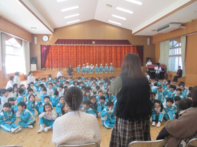 みんなからの歌のプレゼントは年少「はるよこい」年中「青い空に絵を描こう」年長「ありがとうの花」をプレゼント。