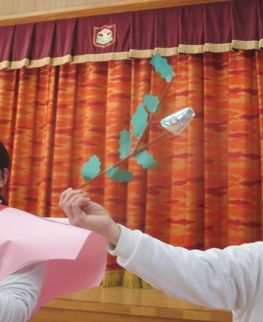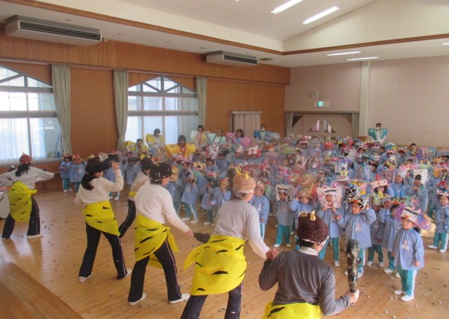 「みんなの心の中に鬼はいないかな?」出てきた鬼に 「鬼は~外!福は~内!!」元気いっぱい、鬼に向かって豆をまきました。「痛い痛い~!!」と鬼は逃げて行きました。あ~よかった!!、みんなの心の中も鬼がいなくなりましたね。