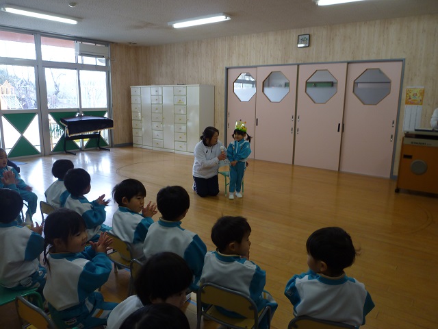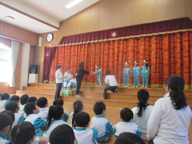誕生会は、園長先生からのプレゼントをいただき、「ありがとうございます。」としっかり挨拶ができるようになりました。