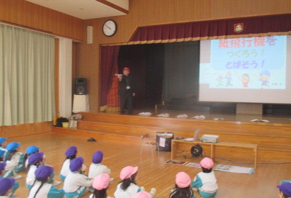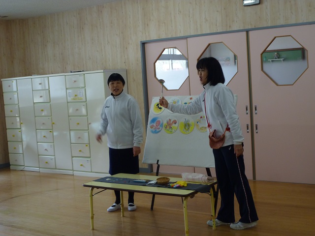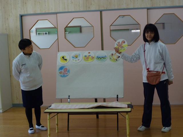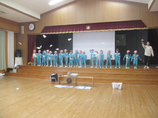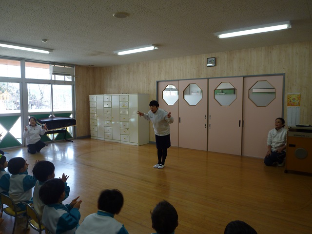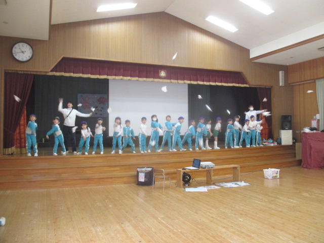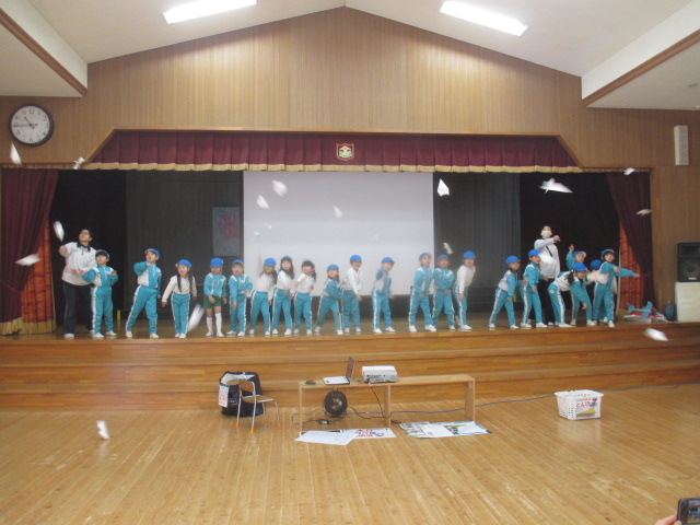 先生からのお話は、「おなかの中に鬼がいる」の影絵でした。影と光の画面に、集中して観ていました。おなかの中の鬼をもらってくれますか??にえ~!!と驚いた様子でした。