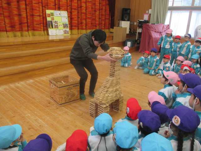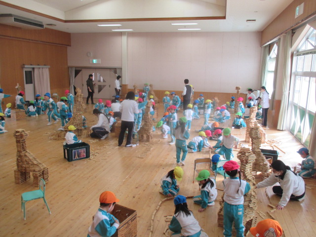 カプラであそぼうがありました。「きりん」をみんなでつくりました。カプラでの年少組~年長組の縦割りグループの取り組みも最終になりました。いろいろな場面で年長児がリードしたり、助けたり、調整をしたり…と立派な「きりん」がたくさんできました。カプラを通して、想像から創造へ、豊かに表現しました。
